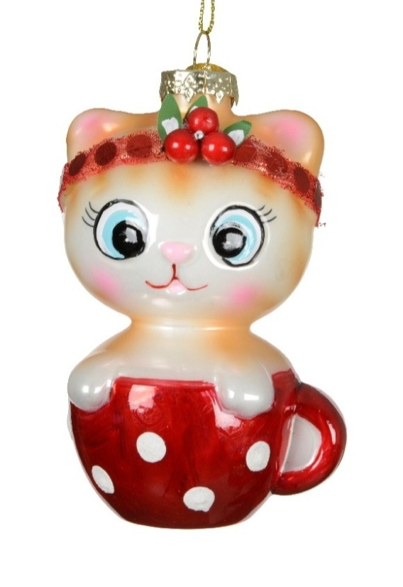 Ta szklana bombka w kształcie kota siedzącego w filiżance to idealna propozycja dla fanów zwierząt i nietuzinkowych ozdób świątecznych. Wykonana z dbałością o detale, zachwyca swoim urokiem, pastelowymi kolorami i bajkowym klimatem. Świetnie sprawdzi się na choince w stylu kawaii, whimsical, pastelowym lub klasycznym.