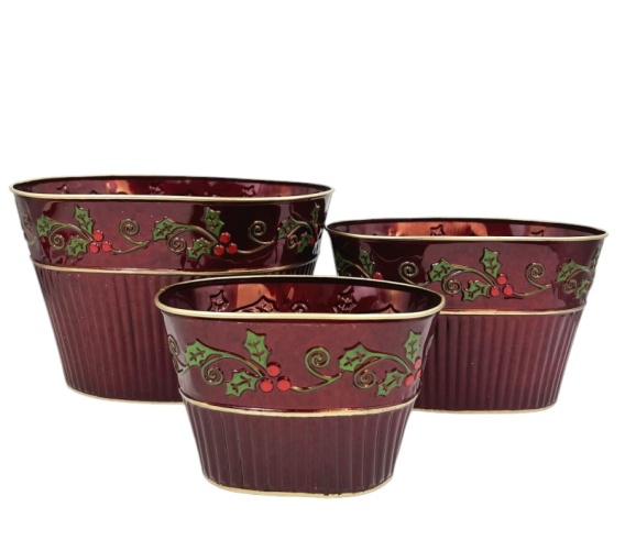 Szukasz idealnego dodatku do świątecznej aranżacji wnętrza? Oto Kpl. 3 osłonki metalowe owalne bordowe (TY0070) wymiary : 12 ,16, 18cm! Komplet trzech ozdobnych metalowych osłonek na doniczki o motywie świątecznym to doskonały sposób, aby dodać blasku i charakteru Twojemu domowi podczas zbliżających się uroczystości. Wykonane z wysokiej jakości materiałów, te bordowe osłonki z motywem ostrokrzewu będą świetnie prezentować się zarówno na stole wigilijnym, jak i jako element dekoracyjny w salonie. Możesz je również wykorzystać do ozdobienia małego cyprysa czy choinki udekorowanej lampkami świątecznymi. Daj swoim roślinom wyjątkowy look z tym efektownym zestawem!