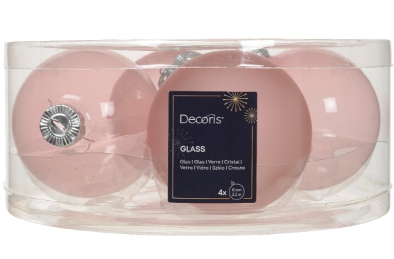 This set of 4 ornaments, each 8 cm in diameter, features a transparent blush pink color in both glossy and matte finishes. The combination of the elegant matte and glossy finishes in blush pink creates a refined and subtle holiday atmosphere.