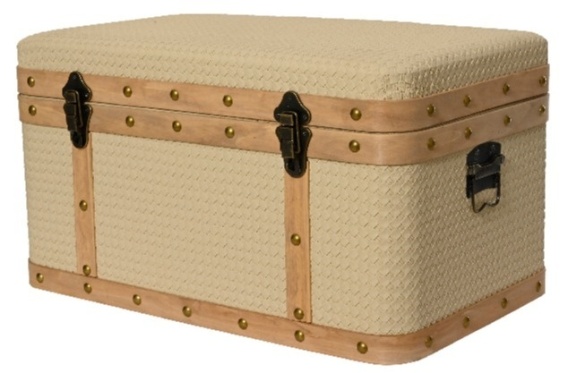 Elegancki zestaw 3 kufrów dekoracyjnych w kolorze beżowym, wykonanych z materiału imitującego skórę i rattan. Idealne do przechowywania, dekoracji wnętrz lub jako oryginalne opakowanie na prezent.