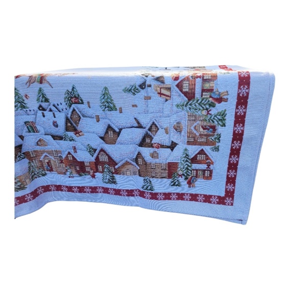 Ożyw swoje wnętrze podczas świąt Bożego Narodzenia z naszym eleganckim obrusem gobelinowym. Jego unikalny wzór z Mikołajem w zaprzęgu nad miastem wprowadza magiczny klimat do każdej uroczystości.