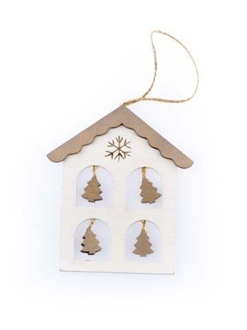 • Zawieszka domek drewniany biały z choinkami 12*10cm (ZS6027)